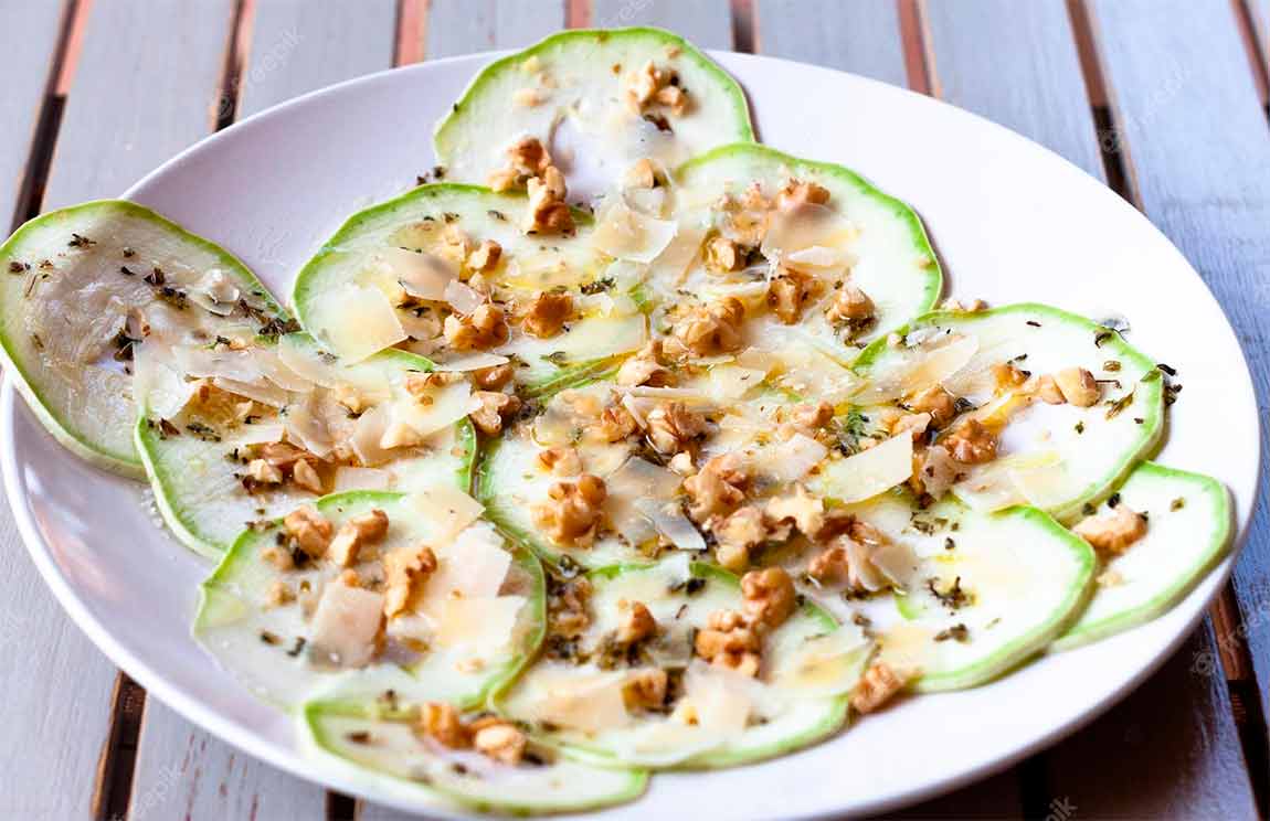 - Presentación Sofisticada: Coloca las finas rodajas de calabacín en un plato grande y plano, superponiéndolas ligeramente para formar una capa única. Agrega los toppings y vierte la marinada suavemente sobre el carpaccio para que se mezclen los sabores de manera armoniosa.
